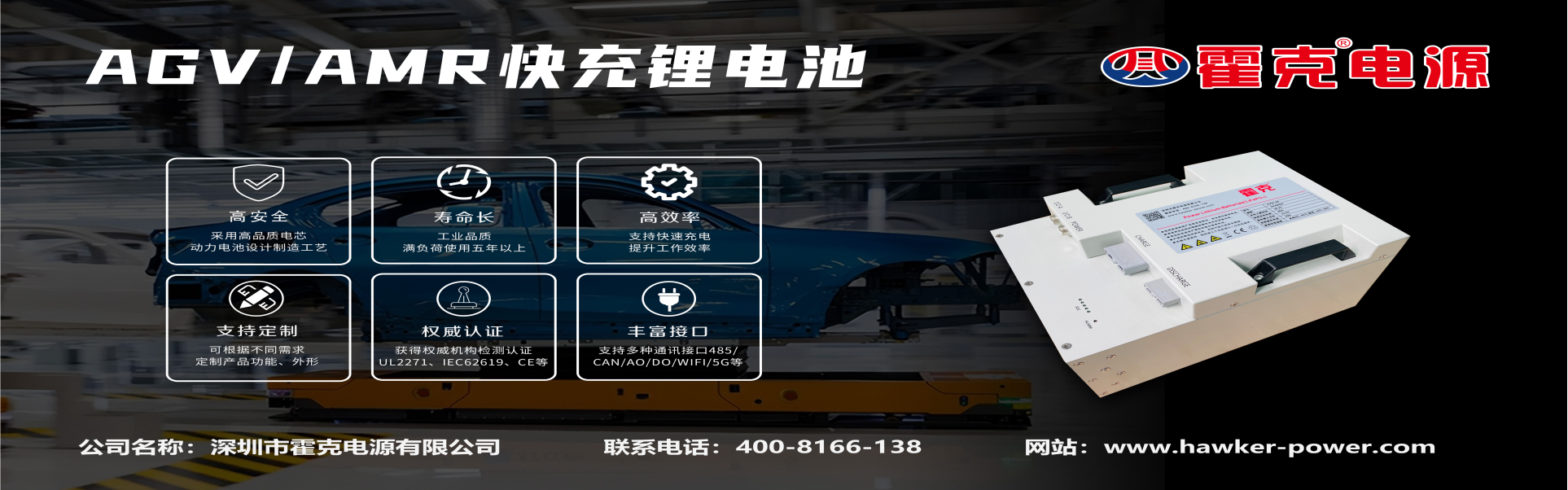 深圳市霍克電源有限公司是專注于移動式機械(包括機器人)動力電源和分布式儲能電源的研發、制造和服務的專業企業。其“霍克?”品牌的鋰電池、鉛酸電池、充電和接電設備歷來在行業內口碑優良,“霍克?”商標更是行業內的馳名商標。公司下設有鋰電池及充電設備生產工廠和鉛酸電池及充電設備生產工廠。多年來,秉承“超越自我,追求卓越”的傳統,不斷加大研發投入,為用戶提供了滿足各種不同使用要求的從設計、制造到安裝、調試的解決方案和定制化產品,“霍克?”電源產品具有先進的自我管理、通訊、安全保護和快速充電等完備功能,滿足了用戶對電源設備使用的更新、更高的要求。目前“霍克?”品牌的各類電源產品已在大型汽車生產企業、大型AGV生產企業等得到廣泛的應用。我們的目標就是為各領域用戶提供更加完善而先進的電源解決方案和定制化產品。